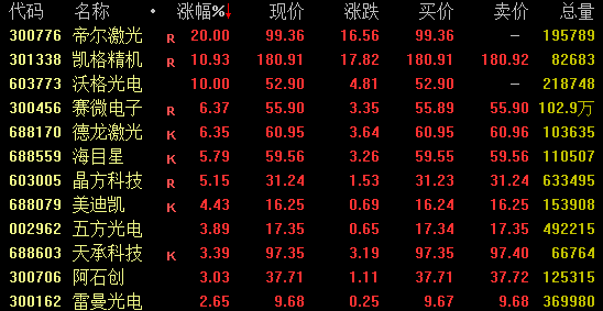 玻璃基板意见盘中强势拉升,戒指收盘,帝尔激光20%涨停,凯格精机涨超10%,沃格光电涨停,赛微电子、德龙激光涨超6%。